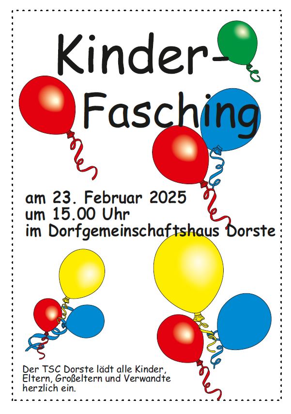 Kinderfasching 2025 Am Sonntag, den 23. Februar 2025, um 15:00 Uhr treffen sich wieder alle kleinen Närrinnen und Narren in der Dorster Festhalle zum bunten Faschingstreiben. Der TSC Dorste lädt alle Kinder, Eltern, Großeltern und Verwandte herzlich ein.