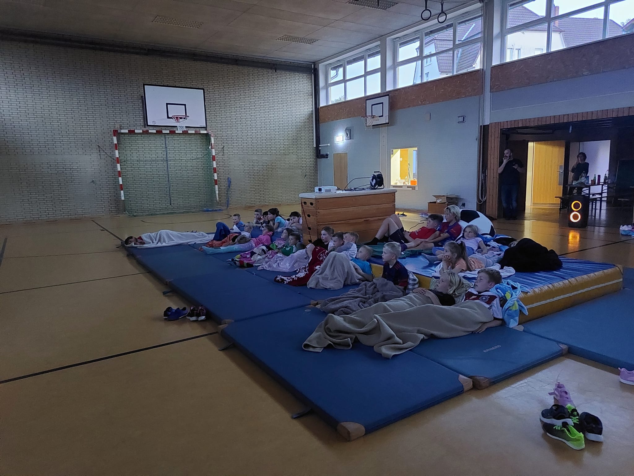 Nach dem Abendbrot folgte das heimliche Highlight des Tages: Mit Decken und Kissen machten es sich alle auf den Sportmatten gemütlich, um gemeinsam einen Film zu schauen. Dieser entspannte Ausklang rundete den Tag ab. Gegen 20:30 Uhr endete die Veranstaltung, und die Kinder wurden müde, aber glücklich von ihren Eltern abgeholt.
